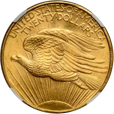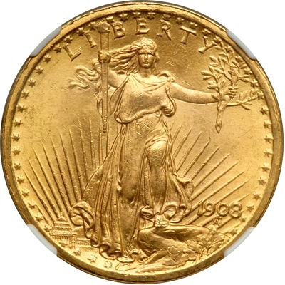 1908 $20 St. Gaudens. No motto. NGC graded MS-66. A lovely choice gem with dazzling mint bloom. Without mincing words, this is a carefully graded, immaculately preserved, and lustrous Gem MS66 that has lovely mint bloom that seesaws with every angle. It is rare to find a coin with such original surfaces, and even more so one struck with such exactitude by the dies. This is such a coin (PCGS # 9142) .