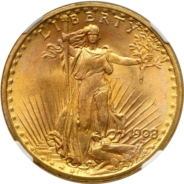 1908. No motto. NGC graded MS-67. Lovely natural pinkish-golden toning. Bright rolling-fresh finish, unsullied as when first struck, awash in originality. Difficult to find. Soft-edged devices and lettering throughout the centers are typical on this issue, as commonly seen; however, a small percentage of this year's production is found with enough convincing detail to be called "bold" and this is one such coin! Pop 272; 22 finer (PCGS # 9142) .