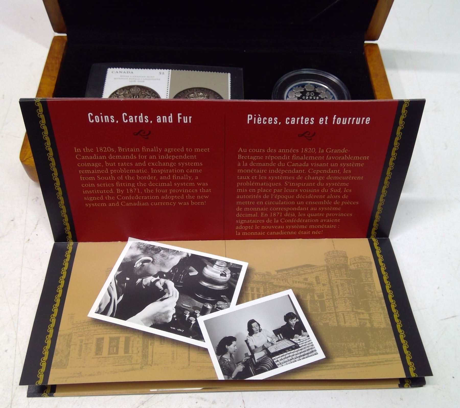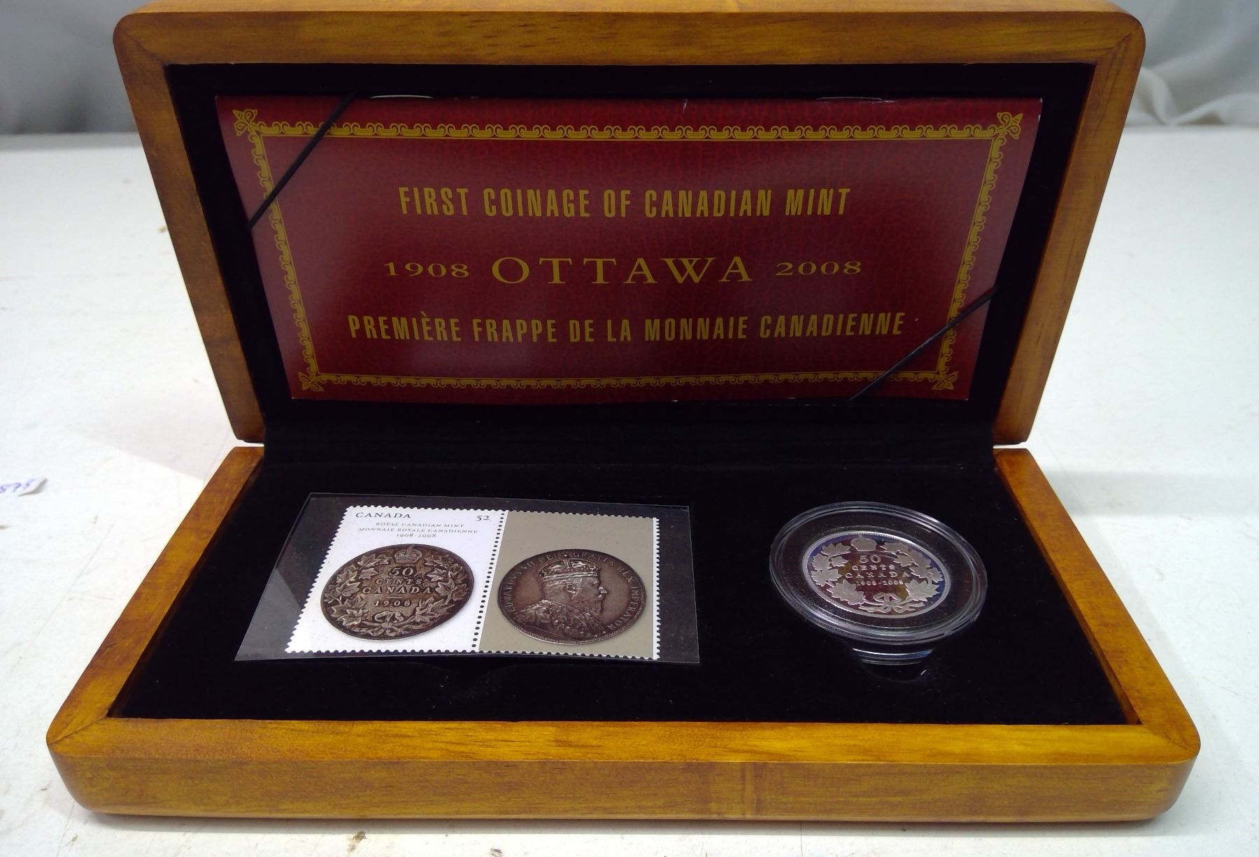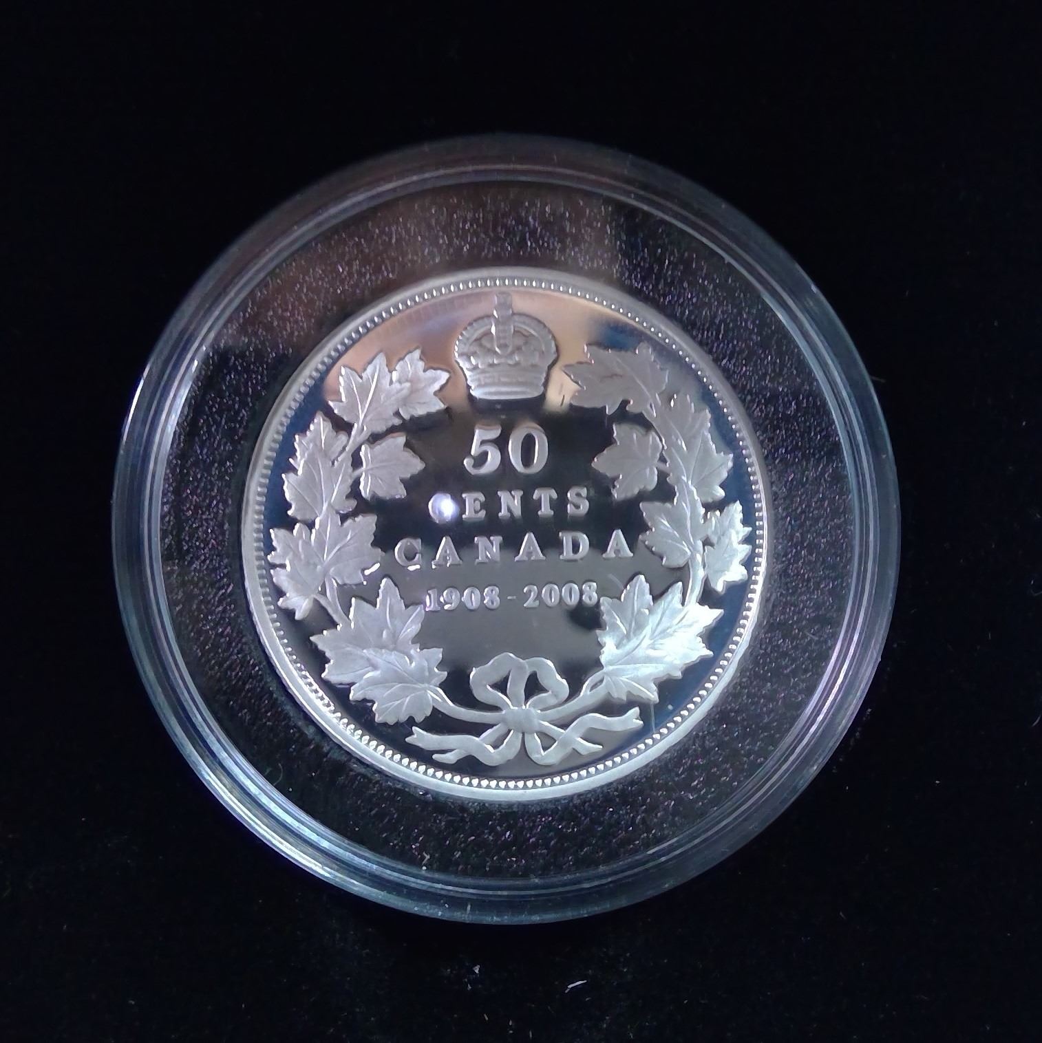 1908 – 2008 100th Anniversary of the Royal Canadian Mint Coin & Stamp Set. Includes 2 Stamps that depict the first Canadian 50 Cents minted in Ottawa. The 50 Cents is Sterling Silver. Reverse of the coin depicts King Edward VII. Proof with Ultra Heavy Cameo. Housed in its original Royal Canadian Mint case & box of issue. Includes Certificate of Authenticity.