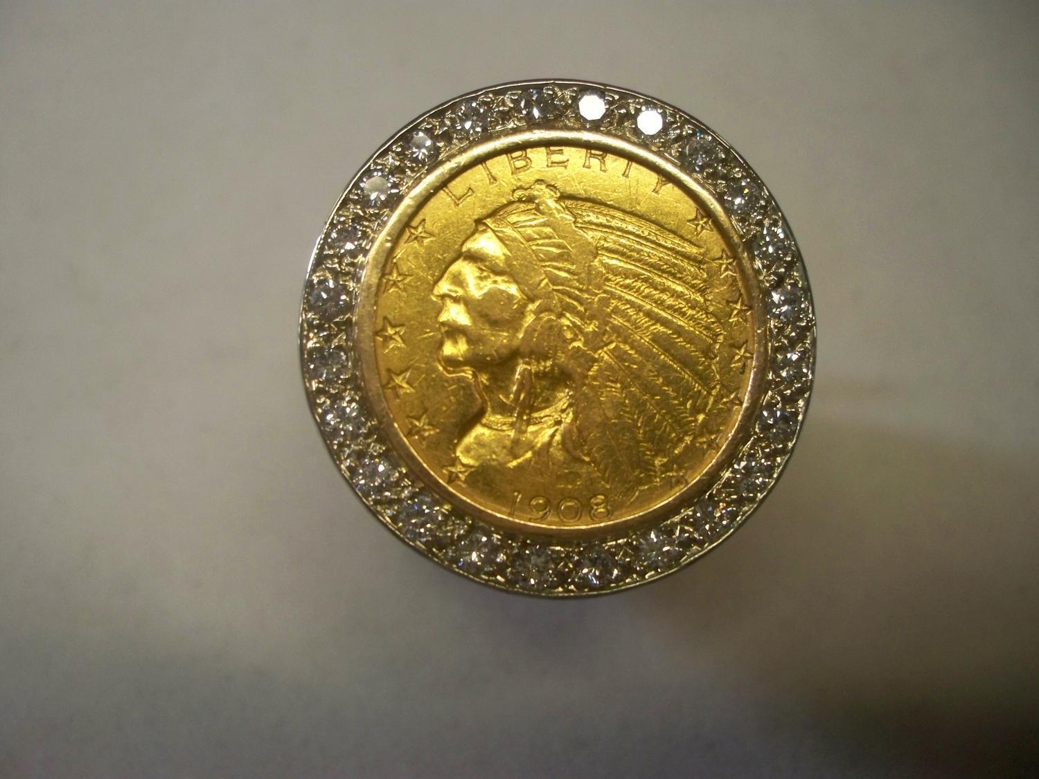 1908 24K $10 Gold Indian Head Coin and 1 Carat of Diamonds in a 14K Gold Ring