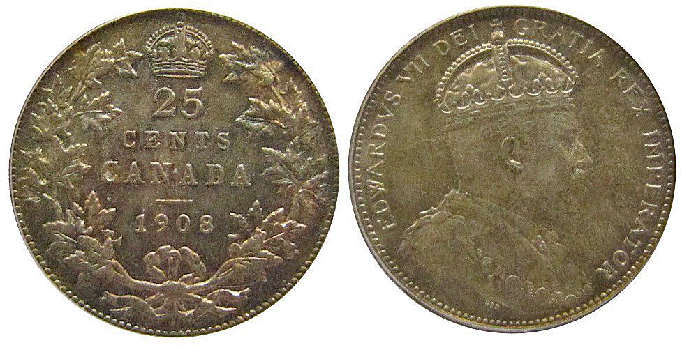 1908 25¢ PCGS MS64. Light to dark tone with underlying lustre.