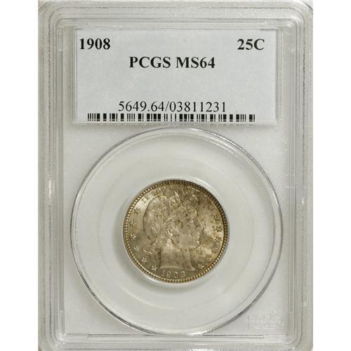 <B>1908 25C MS64 PCGS.</B></I> This softly lustrous Choice example displays dappled tan-gold and silver-gray patina over each side. A well-defined example of this later Barber issue, which quickly approaches the century mark. Population: 54 in 64, 44 finer (3/07).<BR><BR><b>Shipping:</b> Coins & Currency (<a target="_blank" href="http://www.heritageauctions.com/common/shipping.php">view shipping information</a>)
