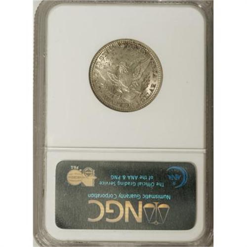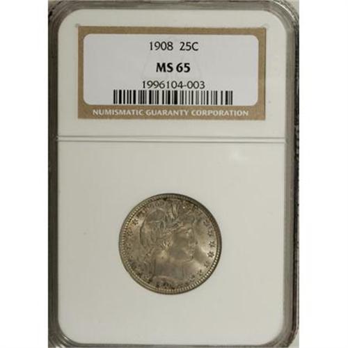 <B>1908 25C MS65 NGC.</B></I> Gem and better examples of circulation-strike Barber silver pose a challenge for collectors today, since few examples were saved near the time of striking. This well-defined and shining representative offers elegant veils of gold and sky-blue toning with faint dots of orange at the margins. Census: 12 in 65, 4 finer (8/07).<BR><BR><B>Coin Engraver:</B> Charles E. Barber<BR><BR><b>Shipping:</b> Coins & Currency (<a target="_blank" href="http://www.heritageauctions.com/common/shipping.php">view shipping information</a>)