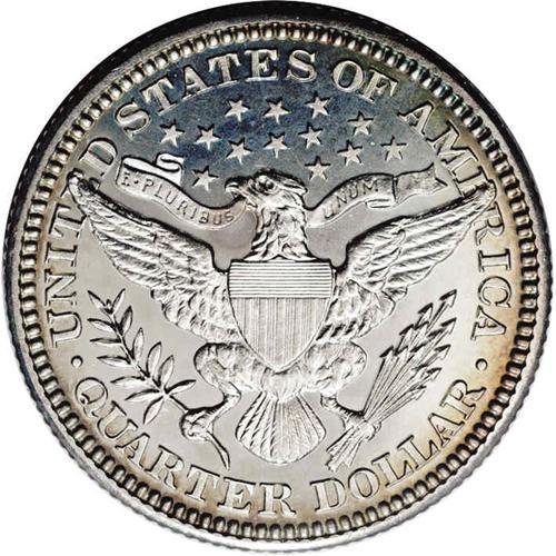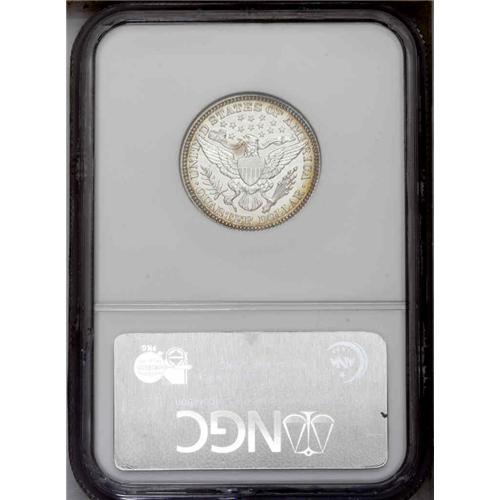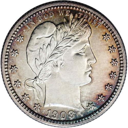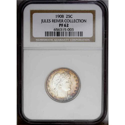 <B>1908<25C> PR62 NGC.</B></I> Orange, ruby, and electric-blue colors invigorate the obverse periphery, while the reverse rim displays honey-brown hues. The strike is virtually unimprovable. Wispy horizontal hairlines are detected on the portrait and right obverse field. A scant mintage of 545 pieces is among the lowest within this scarce but collectible proof series. Envelope Included.
