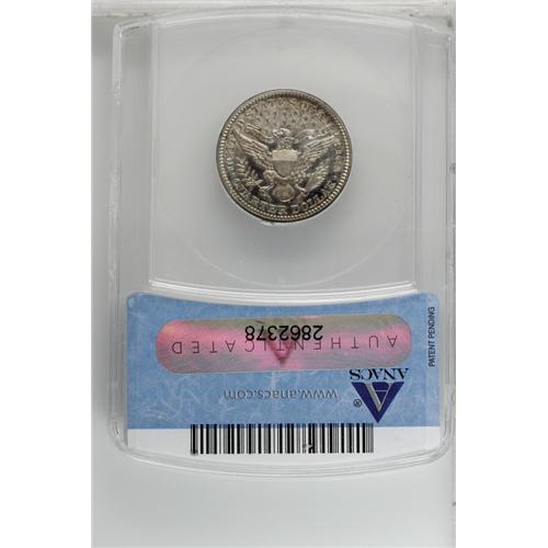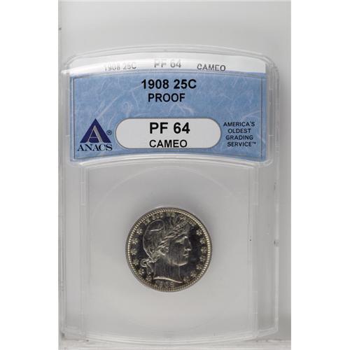 <B>1908<25C> PR64 Cameo ANACS.</B></I> Dashes of plum and golden-brown adorn this flashy and meticulously struck near-Gem. A charming example of the type. A scant 545 proofs were struck.