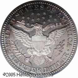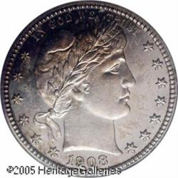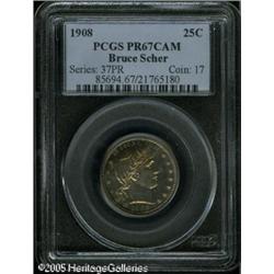 <B>1908 25C PR67 Cameo PCGS.</B></I> Mottled copper-gold and blue iridescence lightly coats near-flawless mirror surfaces. We do note an almost imperceptible blemish between the final T in TRUST and star 7. The contrast between fields and devices is made less obvious by the toning, but is undeniably present. Population: 1 in 67 Cameo, 0 finer (1/05).<BR><I>From the Bruce Scher #1 All-Time PCGS Registry Set.</B></I> Lot:4100