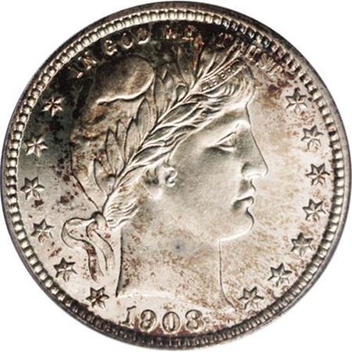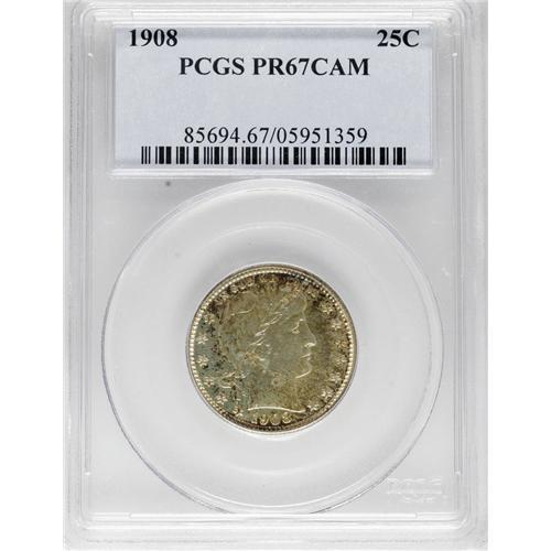 <B>1908 25C PR67 Cameo PCGS.</B></I> While only 545 proof quarters were produced in 1908, PCGS and NGC have certified nearly 300 specimens, but a mere eight examples have been assigned the Cameo designation! Dappled, iridescent golden-brown patina on both sides is joined by mottled, iridescent cobalt-blue and lavender on the reverse border of this Superb Gem Cameo. A solid strike brings out sharpness in the design elements, save for minor softness in the eagle's left (right facing) talon and adjacent arrow feathers. Well preserved throughout. Population: 2 in 67 Cameo, 0 finer (4/07).<BR><BR><b>Shipping:</b> Coins & Currency (<a target="_blank" href="http://www.heritageauctions.com/common/shipping.php">view shipping information</a>)