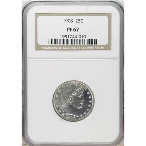 <B>1908 25C PR67 NGC.</B></I> Only the slightest cast of gold is visible over the silver-white surfaces of this exemplary, brilliant Superb Gem coin. The strike is full, with bold detailing on all of the star centrils, the shield corner, and eagle's claws. A small contact mark and a couple of lint marks in the reverse field require mention. Census: 22 in 67, 5 finer (1/07).<BR><BR><b>Shipping:</b> Coins & Currency (<a target="_blank" href="http://www.heritageauctions.com/common/shipping.php">view shipping information</a>)