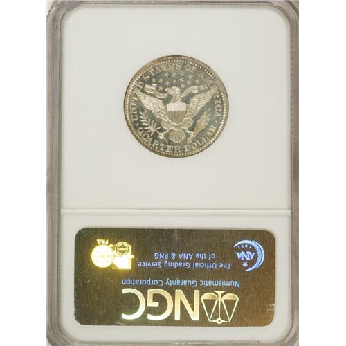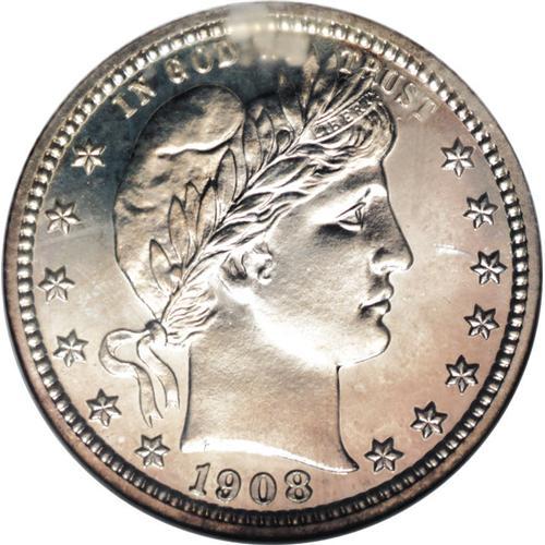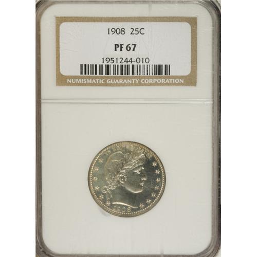 <B>1908 25C PR67 NGC.</B></I> Only the slightest cast of gold is visible over the silver-white surfaces of this exemplary, brilliant Superb Gem coin. The strike is full, with bold detailing on all of the star centrils, the shield corner, and eagle's claws. A small contact mark and a couple of lint marks in the reverse field require mention. Census: 23 in 67, 4 finer (4/07).<BR><BR><b>Shipping:</b> Coins & Currency (<a target="_blank" href="http://www.heritageauctions.com/common/shipping.php">view shipping information</a>)