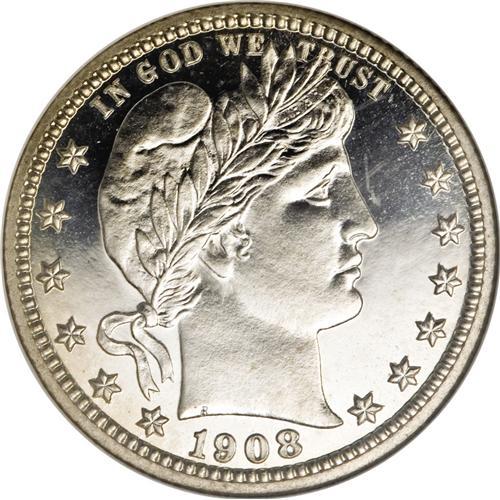 <B>1908 25C PR69 NGC.</B></I> Although it is not designated as a Cameo or Ultra Cameo proof, this piece has lightly contrasting devices and fields. Both sides are fully brilliant with no evidence of toning. Two dates, 1906 and 1908, are the only proof Barber quarters that have never been certified as Cameo or Ultra Cameo by NGC. This grading services as certified 143 Barber quarters of this date, yet this is the single finest example graded (11/06). For comparison, PCGS has certified 181 proofs of this date, and not a single piece has received a grade finer than PR68. This is the single finest proof example of the date certified by either of these grading firms.<BR><BR><b>Shipping:</b> Coin/Currency (<a target="_blank" href="http://www.heritageauctions.com/common/shipping.php">view shipping information</a>)