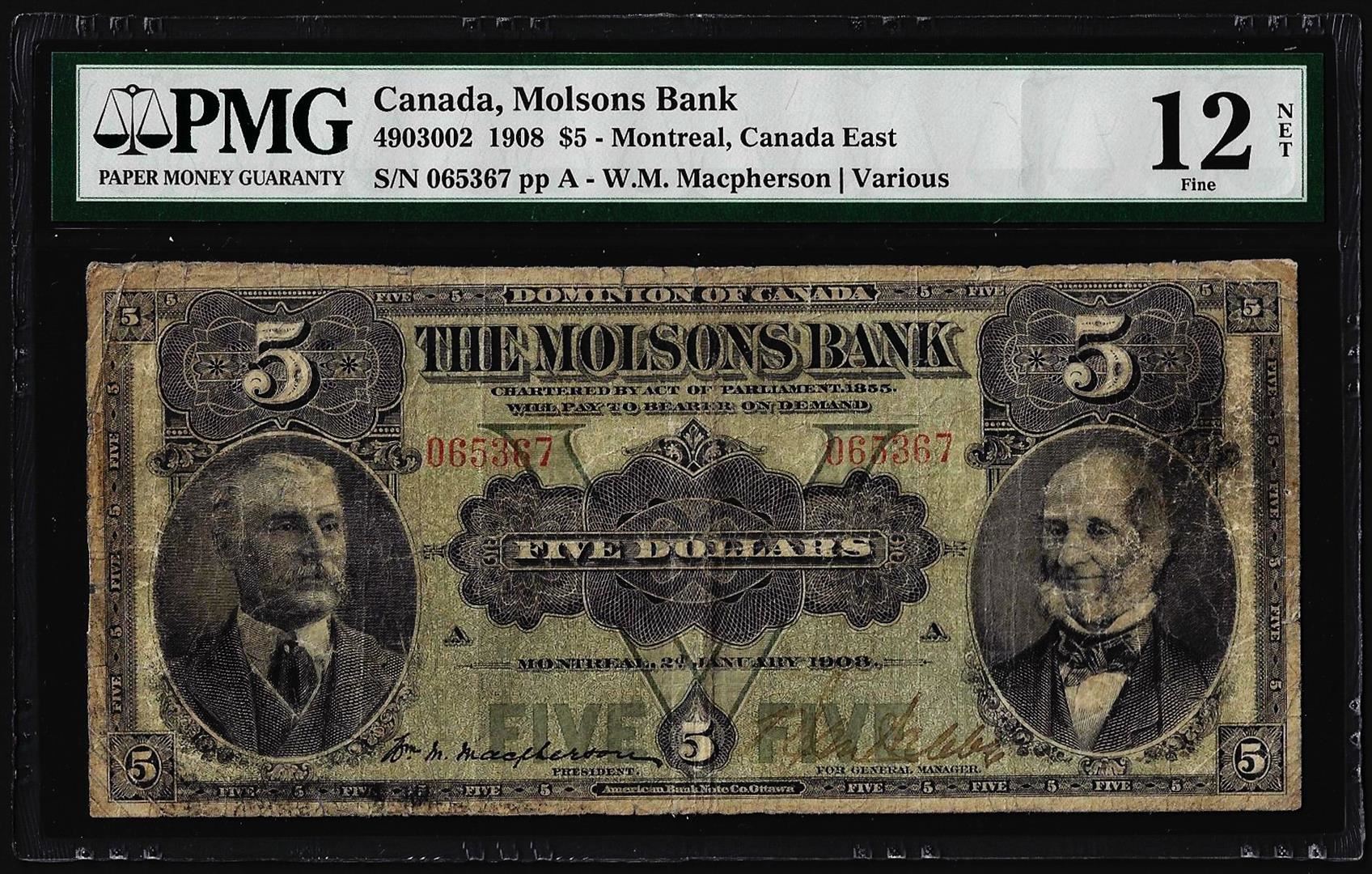 One 1908 $5 Canada Montreal The Molsons Bank Note PMG Fine 12 Net. PMG Certified.