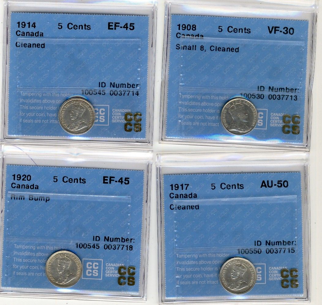 1908 5 Cents VF30, 1914 EF45, 1917 AU, 1920 EF45; Four CCCS coins all with problems.