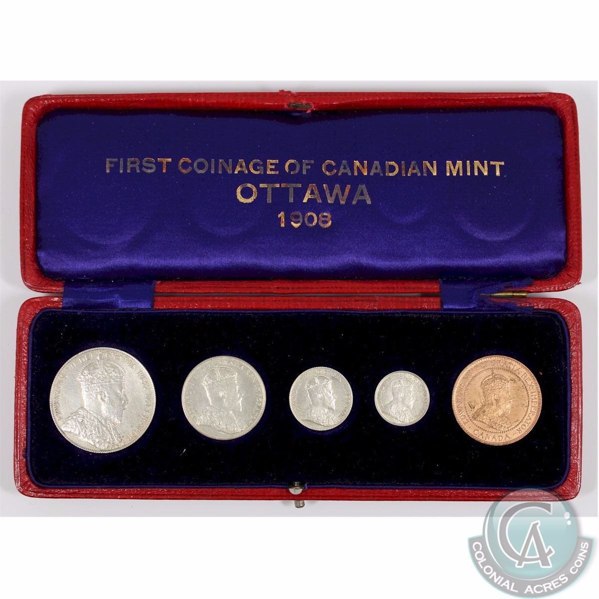 1908 5-Coin Canada Specimen Set in Original Mint Case. The set commemorates the First Coinage Minted on Canadian Soil at the Ottawa Mint. The coins all have consistent Patina and the 1-cent is Near Full Red with only a few wisps of colour. The case is in great shape, we recommend viewing this lot.