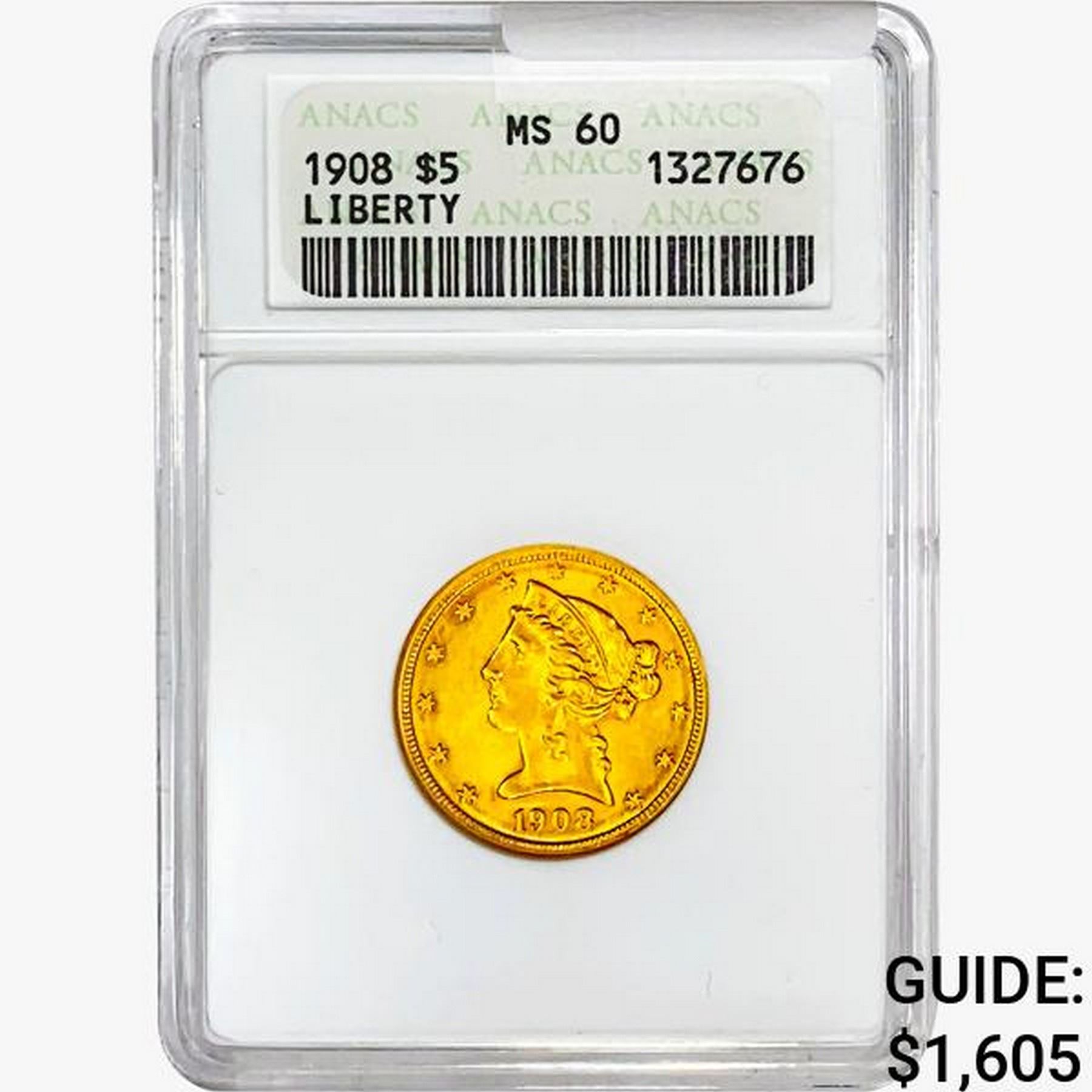 1908 $5 Gold Half Eagle ANACS MS60 Liberty