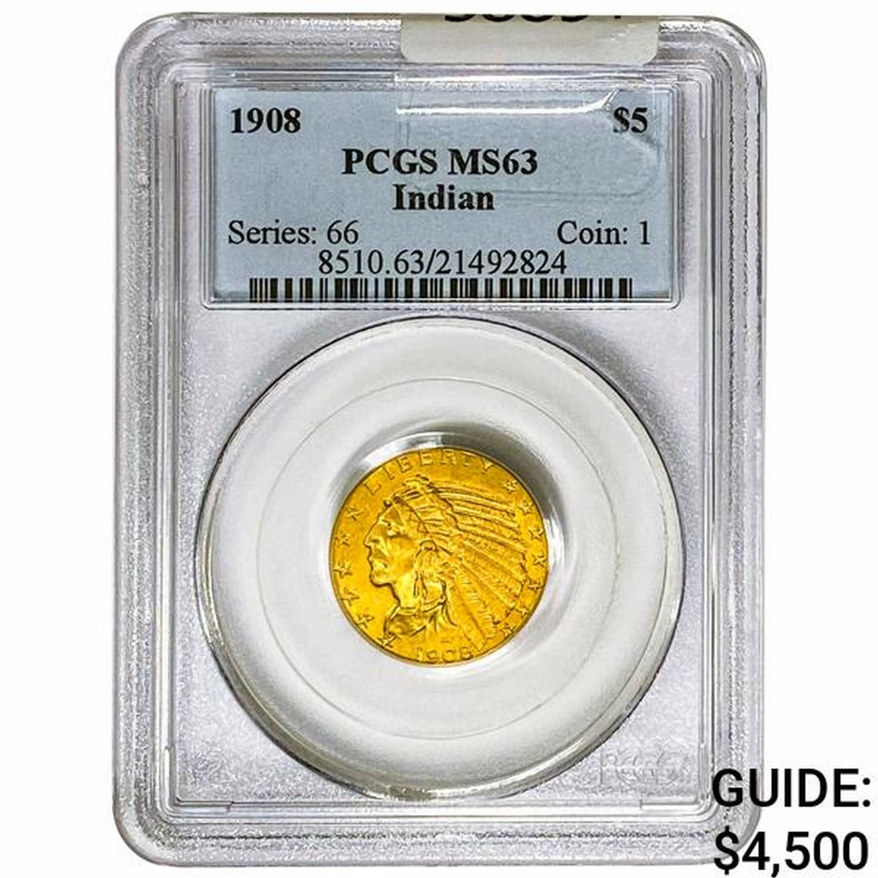 1908 $5 Gold Half Eagle PCGS MS63