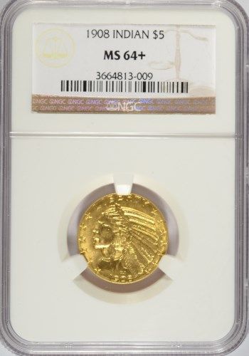 1908 $5 INDIAN GOLD NGC MS64+ SUPERB COIN, MOUNDS OF LUSTRE, A SMALL TINY MARK