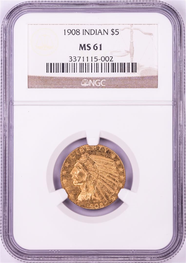 One 1908 $5 Indian Head Half Eagle Gold Coin NGC MS61. NGC Certified.