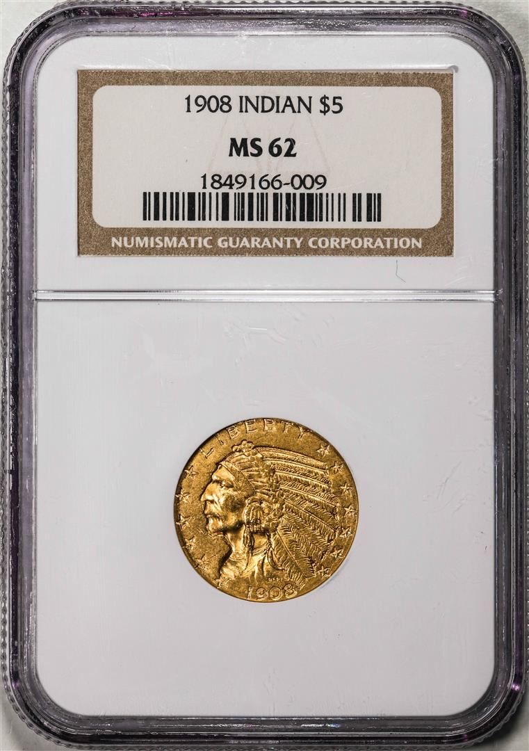 One 1908 $5 Indian Head Half Eagle Gold Coin NGC MS62. NGC Certified.