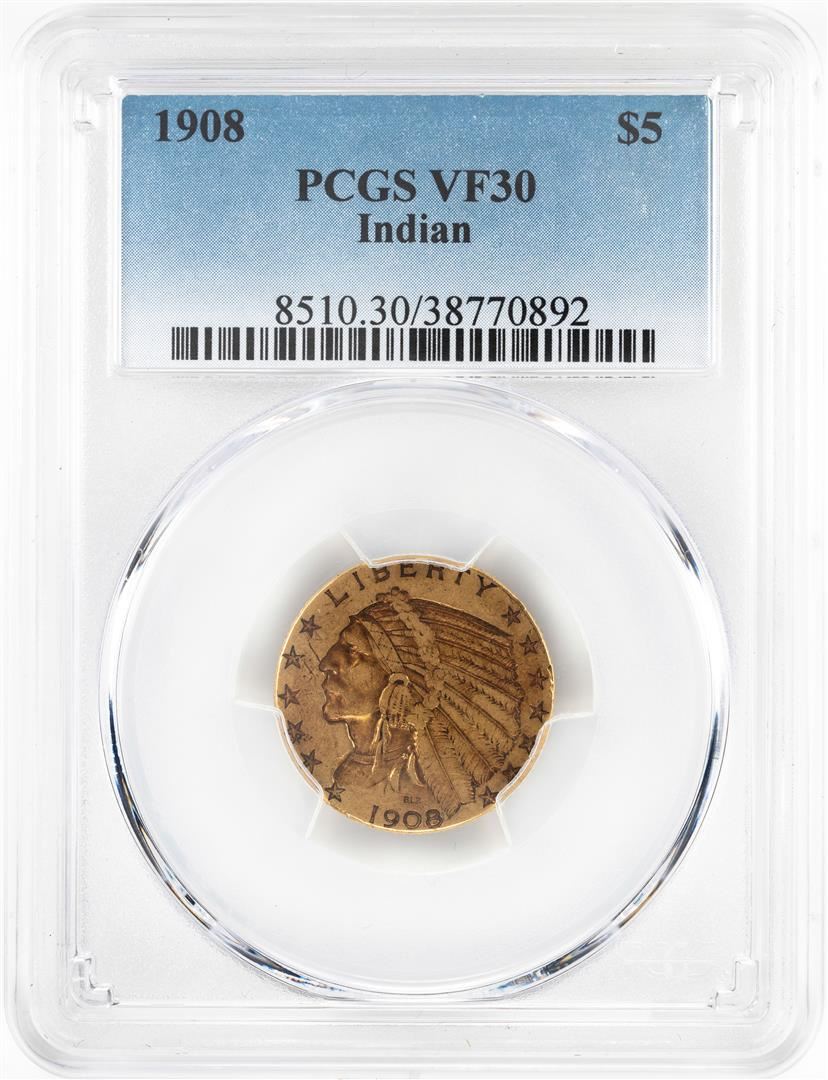One 1908 $5 Indian Head Half Eagle Gold Coin PCGS VF30. PCGS Graded.