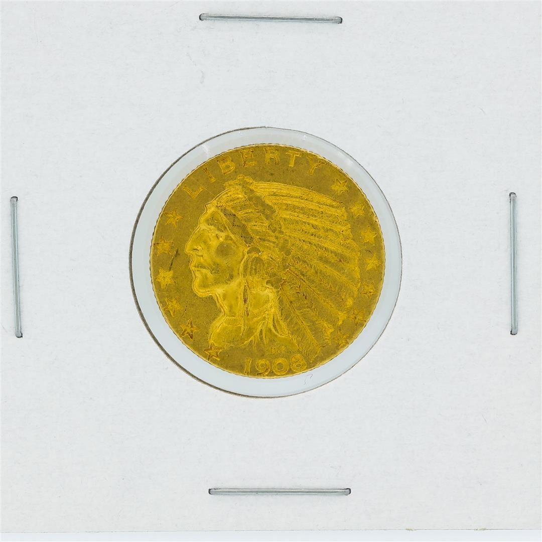 One 1908 $5 Indian Head Half Eagle Gold Coin.