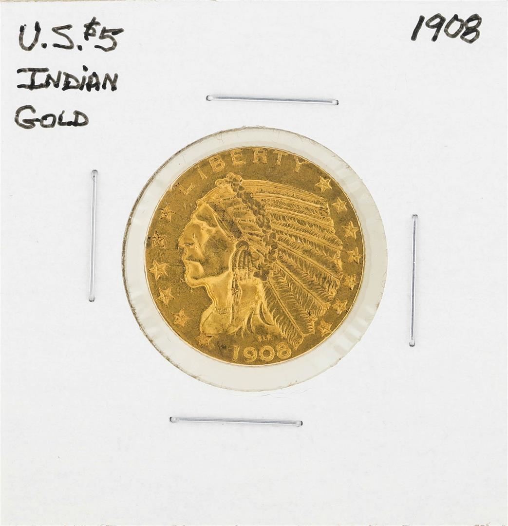 One 1908 $5 Indian Head Half Eagle Gold Coin.