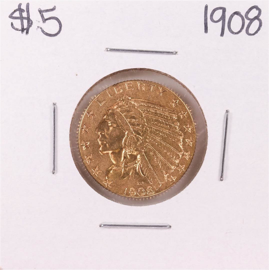 One 1908 $5 Indian Head Half Eagle Gold Coin.