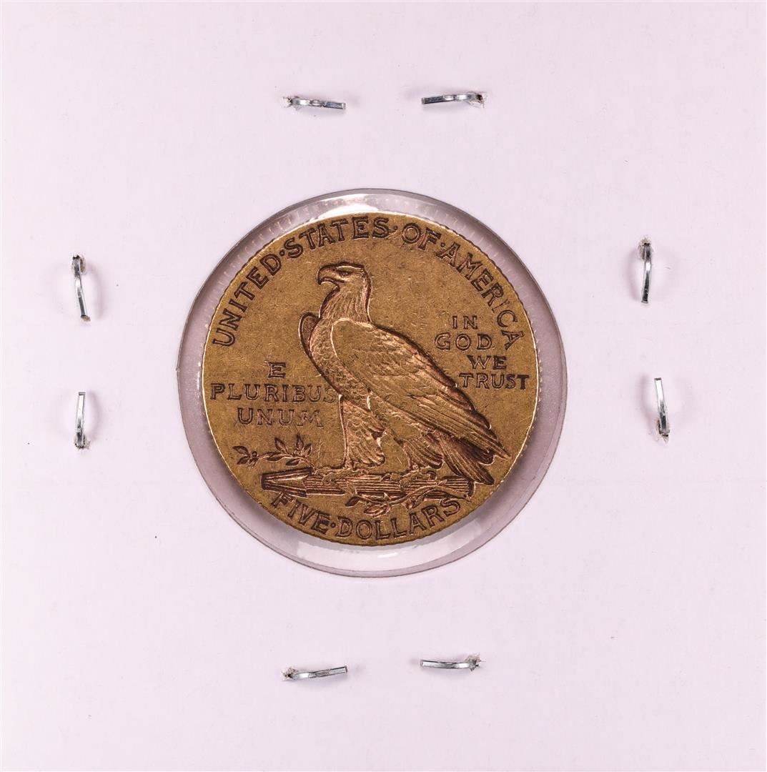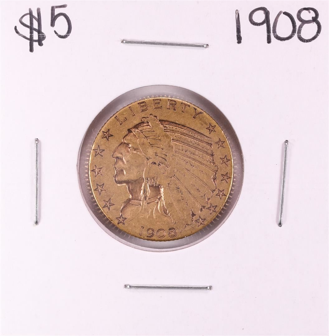 One 1908 $5 Indian Head Half Eagle Gold Coin.