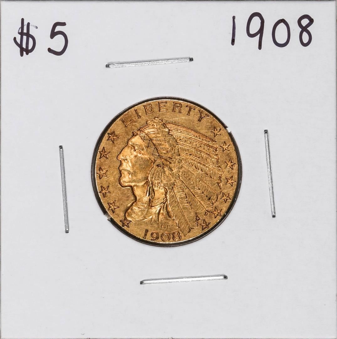 One 1908 $5 Indian Head Half Eagle Gold Coin.