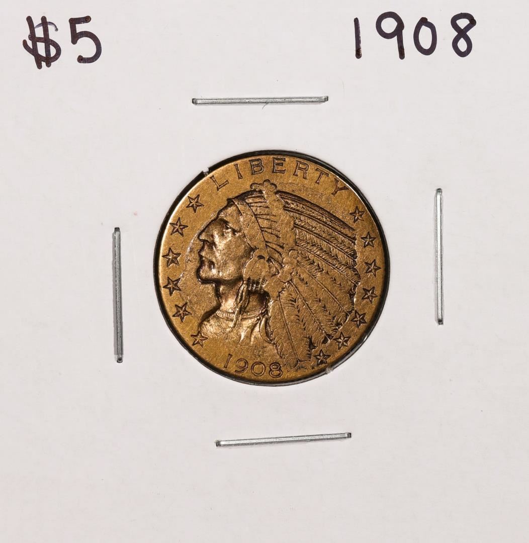 One 1908 $5 Indian Head Half Eagle Gold Coin.