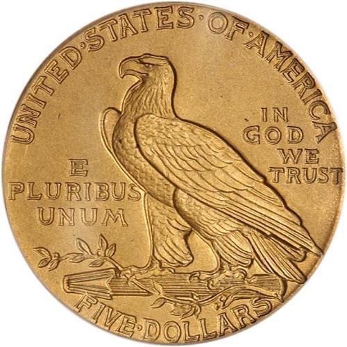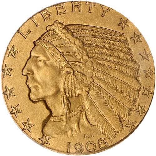 <b>1908 $5 Indian. PCGS graded Proof 64.</b> First year of Bela Lyon Pratt's ingenious "recessed relief" Indian head design. Uniform dark matte finish, granular. Only 167 made; according to Charles E. Green (1936), fewer than 100 released, the rest melted January 2, 1909. This very choice example is one of the sharpest examples that we have offered in its grade. The surfaces are exceedingly choice with smooth light to medium yellow color and a matte or, more properly, sandblast finish, causing intensity of the luster to diminish but substituted myriad diamond sparkles when light hits the surface. As expected, every design element is bold and crisp. A couple of tiny scuffs and hairlines for the Proof 64 grade.