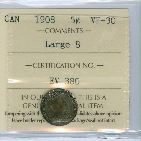 1908 5¢ Large 8 ICCS VF30. Popular variety. Darkly toned.