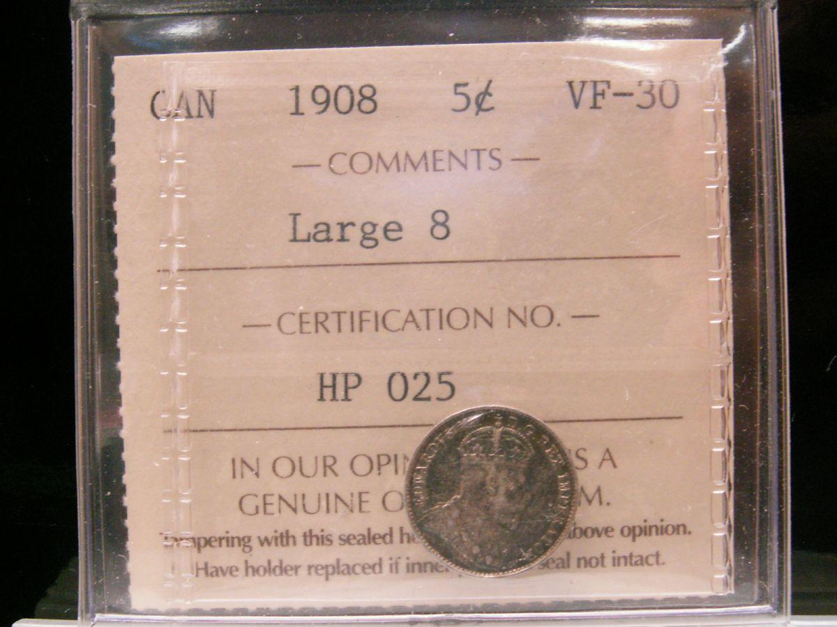 1908 5¢ Large 8 ICCS VF30