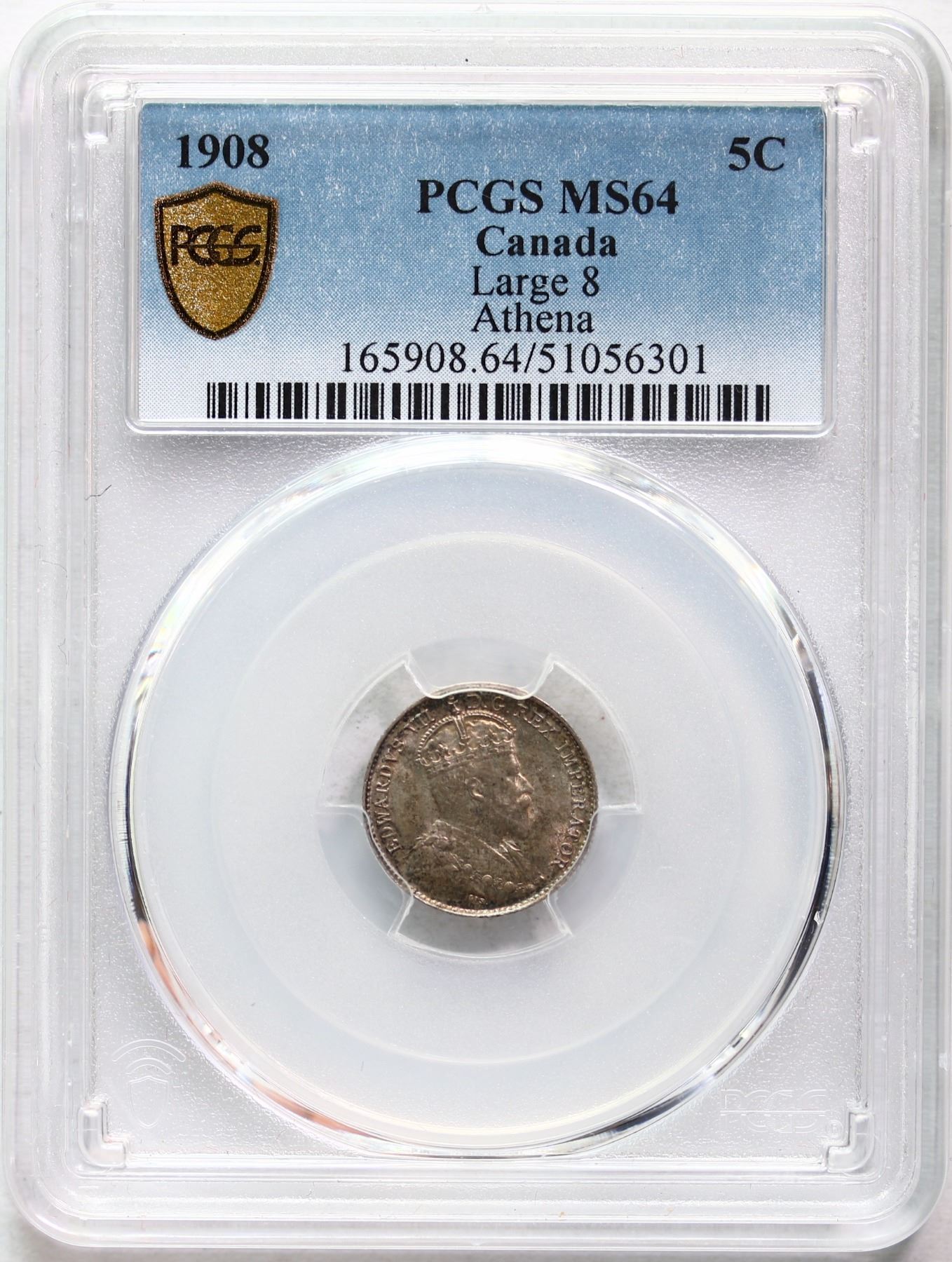 1908 5¢ "Large 8" PCGS Choice Mint State-64. Sought after variety with lots of lustre and light russet and golden hues.