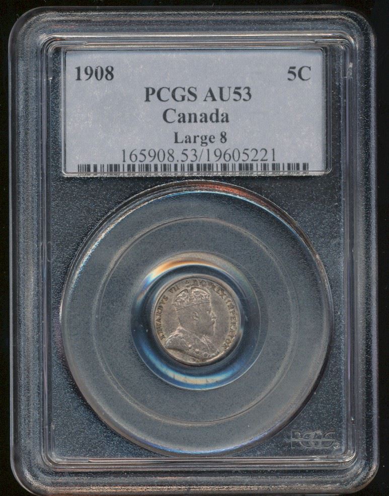 1908 5¢ Lg 8 PCGS AU53. Popular variety.