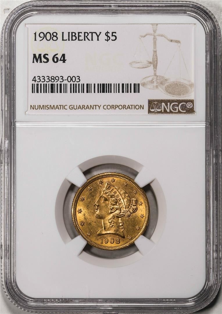 One 1908 $5 Liberty Head Half Eagle Gold Coin NGC MS64. NGC Certified.