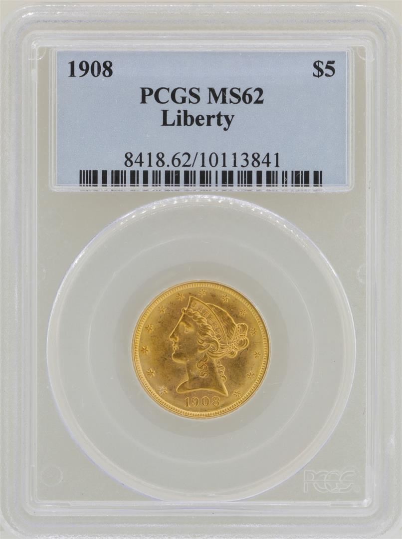 One 1908 $5 Liberty Head Half Eagle Gold Coin PCGS MS62. PCGS Graded.