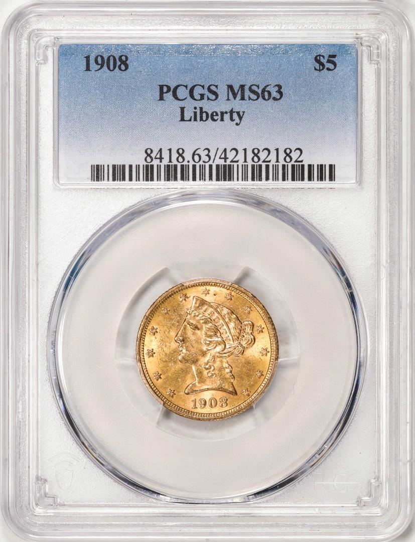 One 1908 $5 Liberty Head Half Eagle Gold Coin PCGS MS63. PCGS Graded.