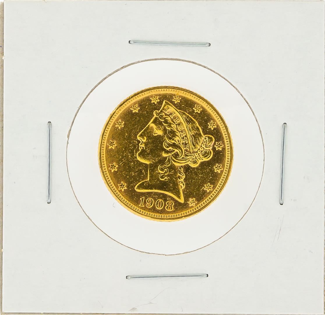 One 1908 $5 Liberty Head Half Eagle Gold Coin.
