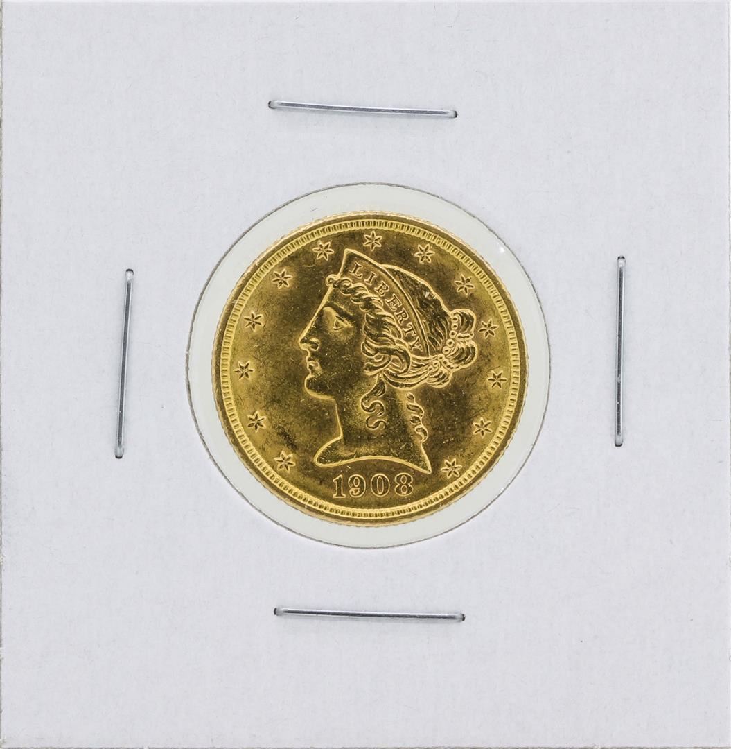 One 1908 $5 Liberty Head Half Eagle Gold Coin.
