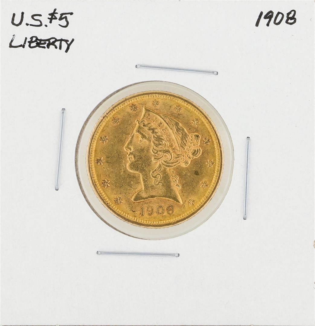 One 1908 $5 Liberty Head Half Eagle Gold Coin.