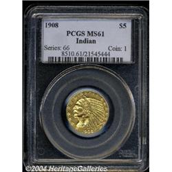 <B>1908<$5> MS61 PCGS.</B></I> Typically marked with unusually bright luster and good color. Some striking weakness is noted on the eagle's wing. <BR><BR><B>Important notice:</B> Heritage usually auctions material at the rate of 200-250 lots per hour. On some occasions eBay Live bid software or the Internet may not be able to keep up with the pace of the auction. We recommend placing a realistic absentee bid now as insurance to avoid disappointment. Occasionally the auctioneer may eliminate or reject an eBay Live bid, and the auctioneer may also reopen a lot after the close of the eBay live bidding (usually because we missed an audience bid), and may reject your bid even if it shows you as the winning bidder. By bidding via eBay Live, you agree that Heritage may award the lot to another bidder at its sole discretion under the circumstances described above or any other reasonable circumstances. Since eBay bids are not shown to us until we open the lot on the floor, we treat those bids just like floor bids. In most cases the floor responds before the eBay bid is presented to us, due to Internet lag time, so for consistency we have made it a policy that floor bids are always considered first over tie eBay live bids. Also please note that all Heritage lots purchased through eBay Live carry a 20% Buyer's Premium. Please make sure you read the Terms and Conditions before you bid.