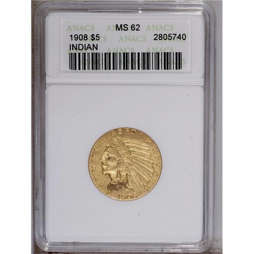 <B>1908 $5 MS62 ANACS.</B></I> Well struck, except for the eagle's shoulder, with rich golden-orange coloration, a carefully preserved obverse, and a few minor field marks and a couple of faint pinscratches on the reverse.