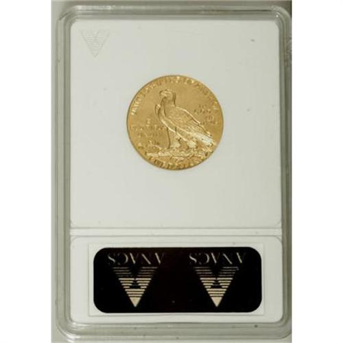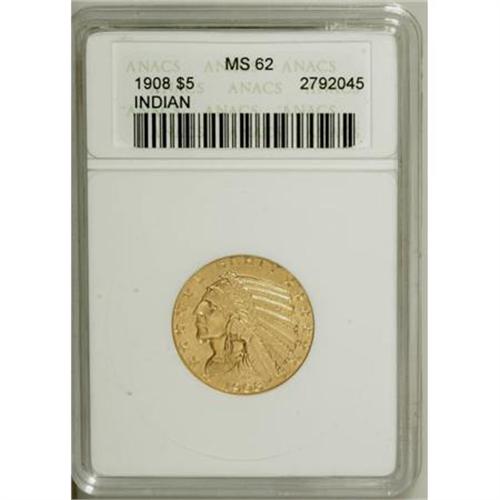 <B>1908 $5 MS62 ANACS.</B></I> NGC Census: (1391/1168). PCGS Population (1024/1624). Mintage: 577,800. Numismedia Wsl. Price for NGC/PCGS coin in MS62: $1,175. (#8510)<BR><BR><B>Coin Engraver:</B> Bela Lyon Pratt<BR><BR><b>Shipping:</b> Coins & Currency (<a target="_blank" href="http://www.heritageauctions.com/common/shipping.php">view shipping information</a>\)