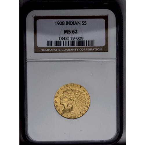 <B>1908<$5> MS62 NGC.</B></I> This olive-gold introductory-year type coin is well struck and lustrous. At first glance, the piece appears to merit a finer grade, although a few minor marks are noted on the left obverse upon close inspection.
