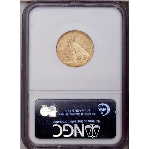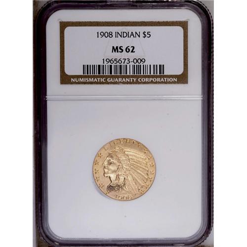 <B>1908<$5> MS62 NGC.</B></I> Well struck except on the eagle's shoulder with a bright satiny appearance and pleasant straw-gold toning. Wispy pinscratches are noted in the reverse fields. An attractive example of this first year of type.