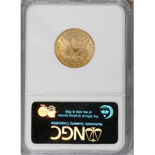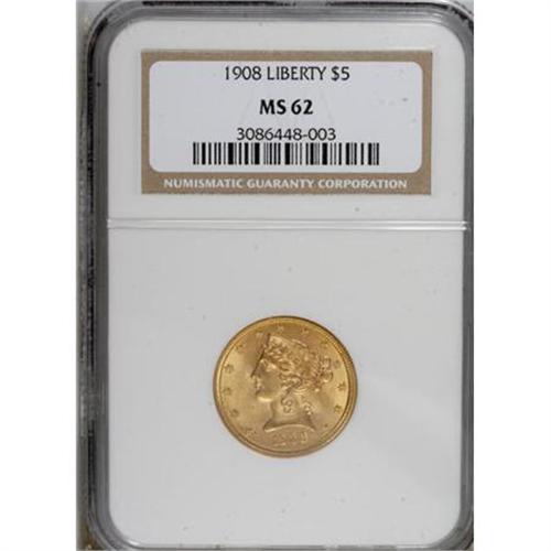 <B>1908 $5 MS62 NGC.</B></I> NGC Census: (1440/1888). PCGS Population (1135/1843). Mintage: 421,874. Numismedia Wsl. Price for NGC/PCGS coin in MS62: $310. (#8418)<BR><BR><B>Coin Engraver:</B> Christian Gobrecht<BR><BR><b>Shipping:</b> Coins & Currency (<a target="_blank" href="http://www.heritageauctions.com/common/shipping.php">view shipping information</a>)