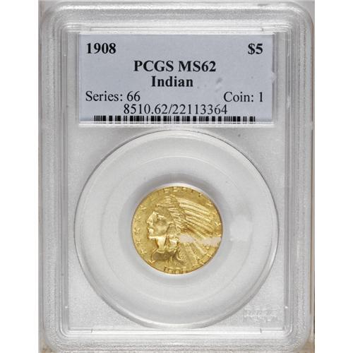 <B>1908<$5> MS62 PCGS.</B></I> A subtly lustrous orange-gold example with excellent detail for this issue. Some small abrasions are noted on each side, particularly on the cheekbone.