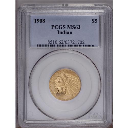 <B>1908 $5 MS62 PCGS.</B></I> A well struck first-year example with lovely khaki-gold color and an exceptionally bold strike. A few minor contact marks, mostly on the reverse, preclude a higher grade.