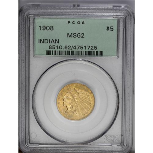 1908 $5 MS62 PCGS. The yellow-orange surfaces are rath