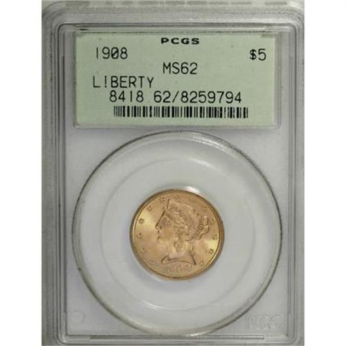 <B>1908 $5 MS62 PCGS.</B></I> . PCGS Population (1151/1875). NGC Census: (1478/1935). Mintage: 421,874. Numismedia Wsl. Price for NGC/PCGS coin in MS62: $325. (#8418)<BR><BR><B>Coin Engraver:</B> Christian Gobrecht<BR><BR><b>Shipping:</b> Coins & Currency (<a target="_blank" href="http://www.heritageauctions.com/common/shipping.php">view shipping information</a>)